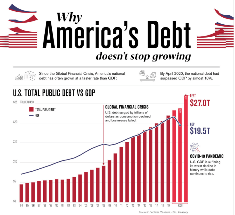 ⚠️ US debt is at historical highs; spending far exceeds revenue.